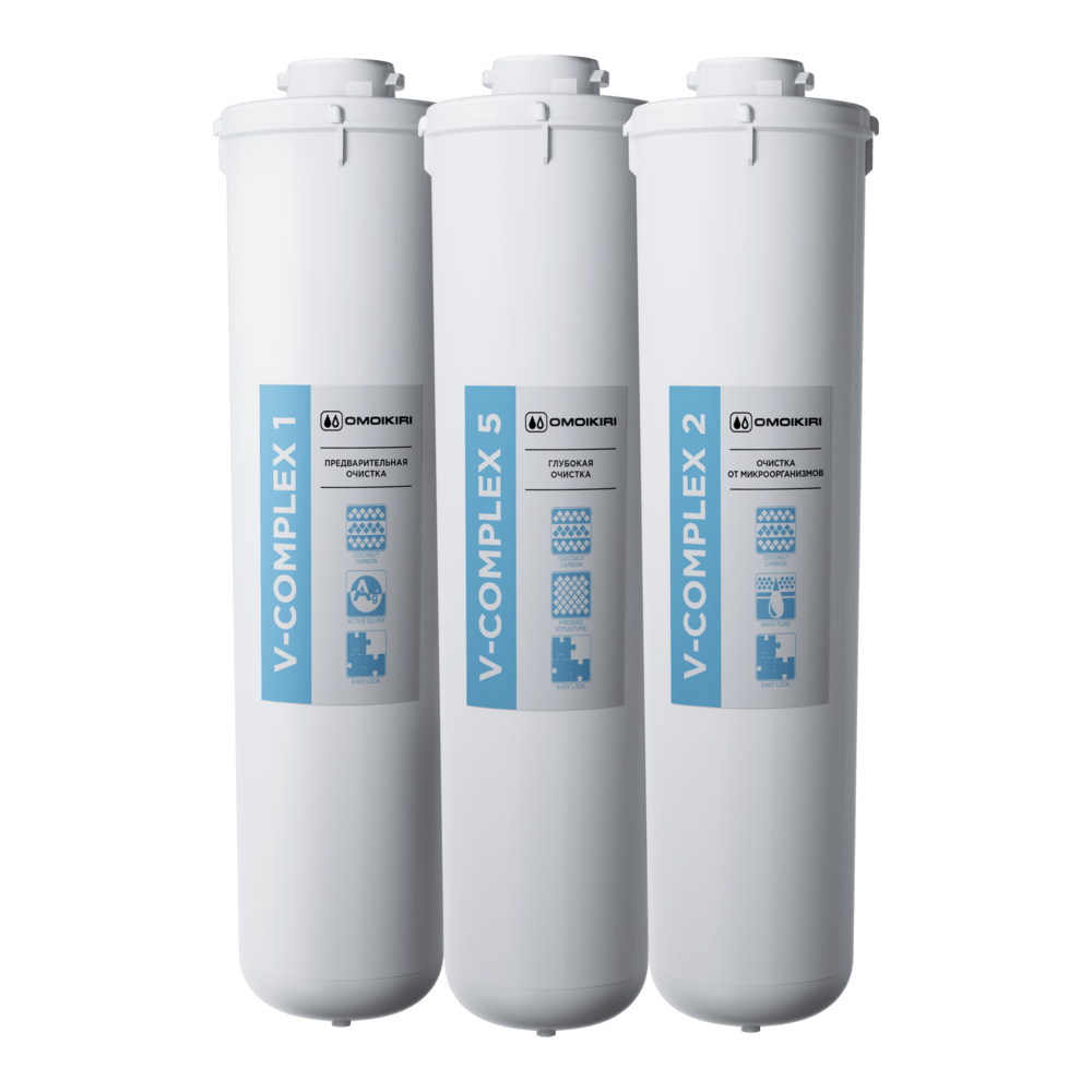 V-Complex 1. Предварительная сорбционная очистка. Карбонблок с ионами серебра в нити Vivalon. Тонкость очистки – 5 мкм.