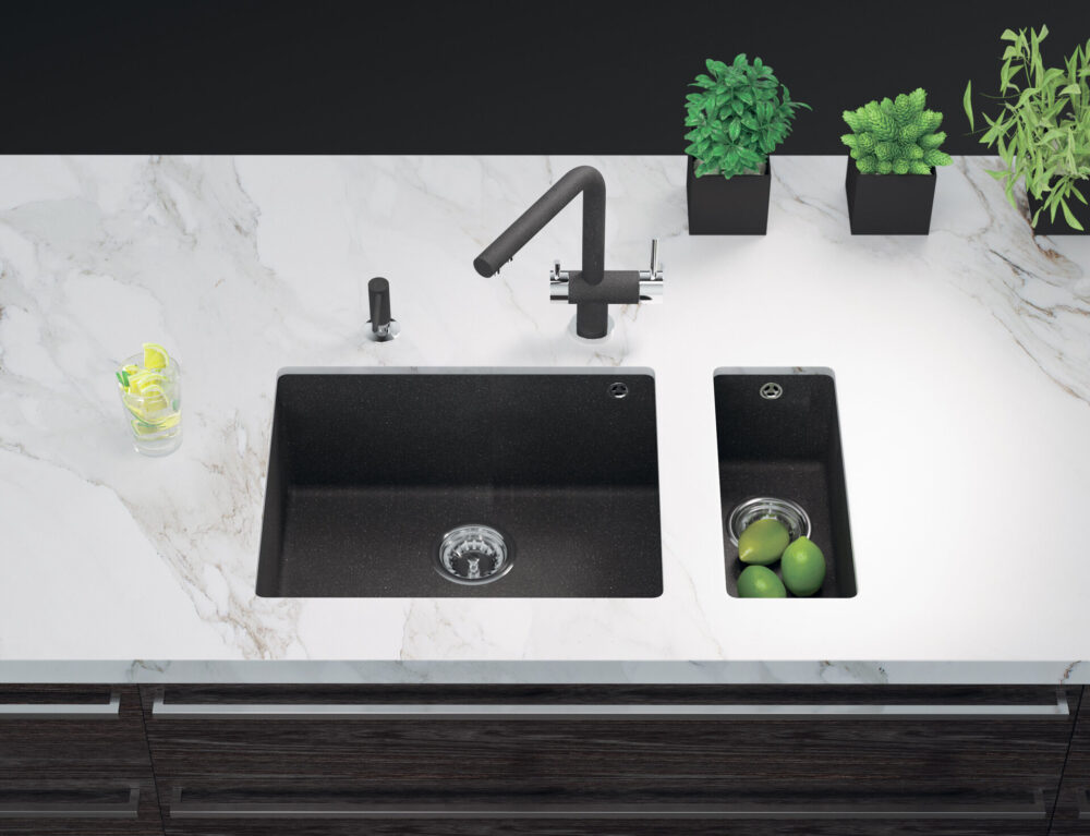 • Мойка черного цвета создана из материала «Tetogranit Metal». В его составе: акриловая смола и натуральный гранит с добавлением металлических частиц, которые придают блеск и мерцание поверхности мойки. «Tetogranit Metal» отличается максимальной устойчивостью к температурным перепадам, ударам, царапинам и пятнам;